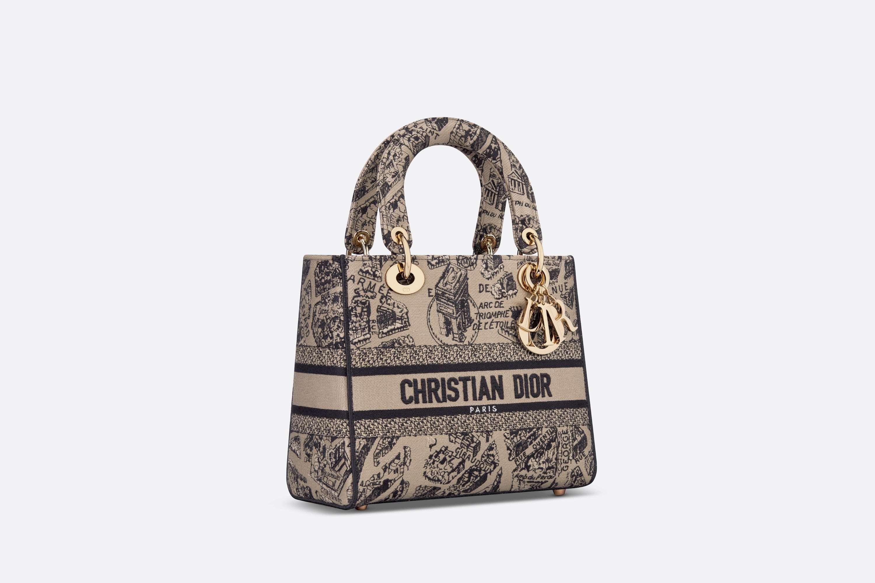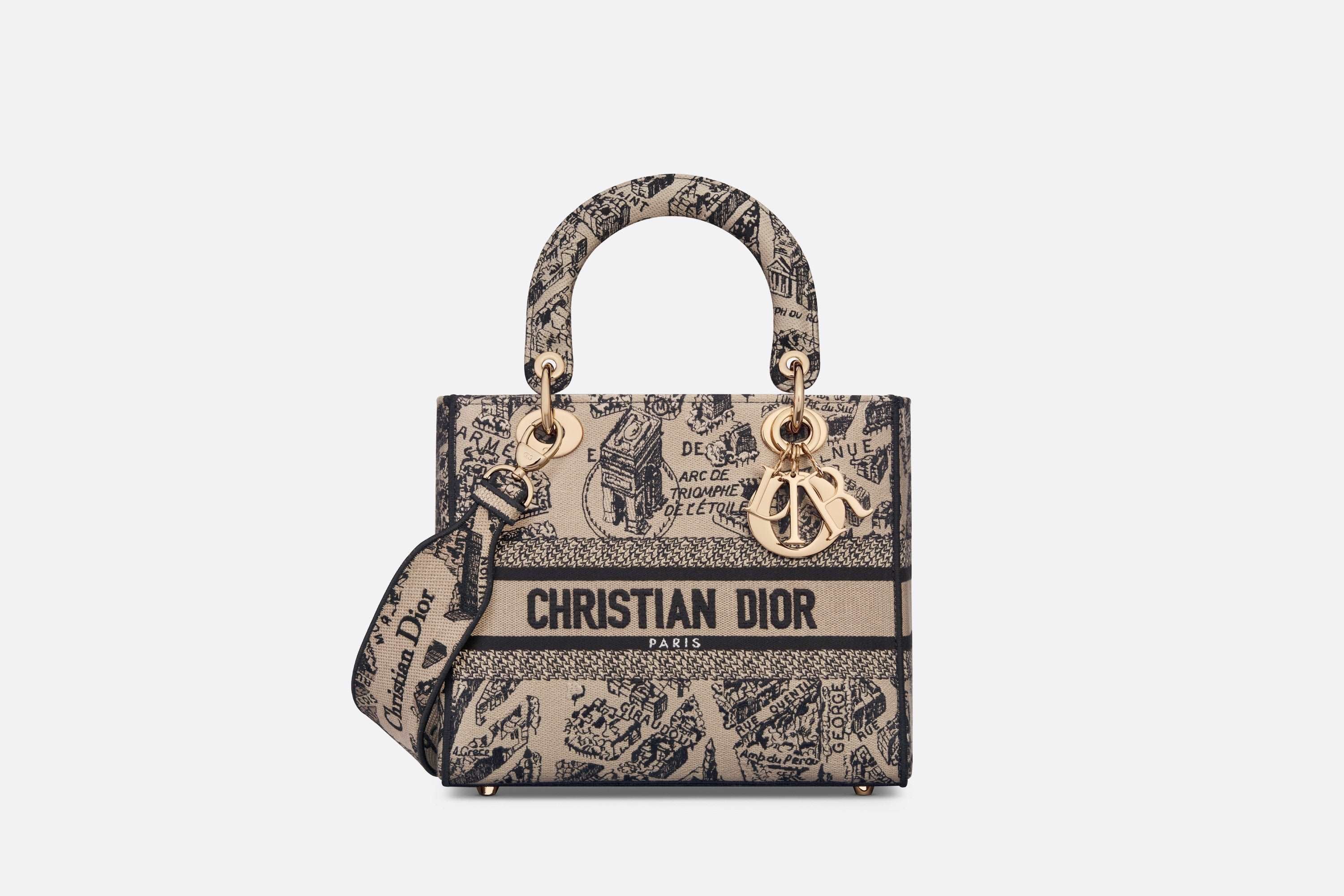 クラシックなエレガンスとメゾンのモダニティを併せ持つ「レディ D-ライト」バッグ。メゾンのアーカイブに着想を得てディオールの歴史発祥の地であるモンテーニュ通りの周辺図を描いた、ベージュ & ブラックの「Plan de Paris (プラン ドゥ パリ)」モチーフの刺繍を全面に施したモデルです。フロントにはChristian Dior Parisシグネチャーでアクセントをプラス。ペールゴールドトーンのメタル製D.I.O.R.チャームで輝きを添え、シルエットの美しさを引き立てました。幅広でリバーシブルの刺繍入りショルダーストラップは取り外すことができ、ハンドバッグとしてはもちろんクロスボディバッグとしてもお使いいただけます。他の「プラン ドゥ パリ」アイテムと合わせてスタイリングできるミディアムサイズのモデルです。