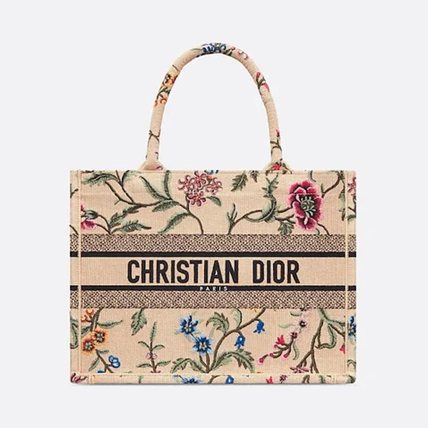 Introduced by Maria Grazia Chiuri. Creative Director of Christian Dior. the Dior Book Tote has become a staple of the Dior aesthetic. Designed to hold all daily essentials. the style is crafted in natural raffia embroidered with a multicolor Dior Petites Fleurs motif. a romantic and vibrant homage to Mr. Dior's passion for florals. Adorned with the Christian Dior Paris signature on the front. the medium tote exemplifies the House's signature savoir-faire and may be carried by hand or worn over the shoulder.