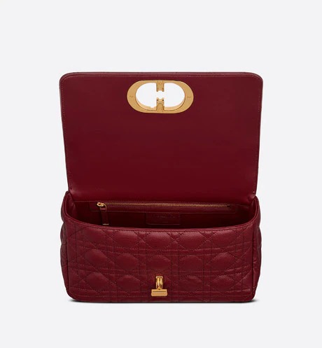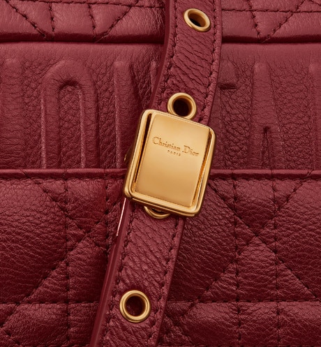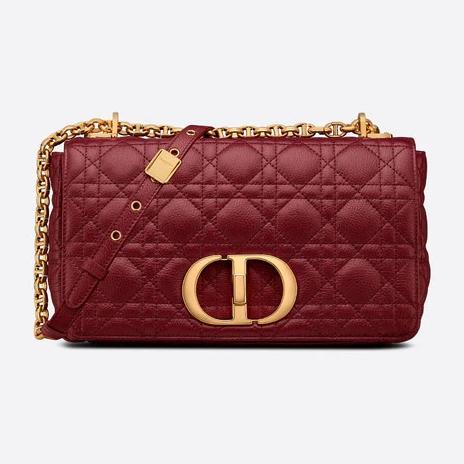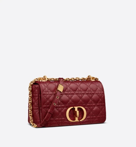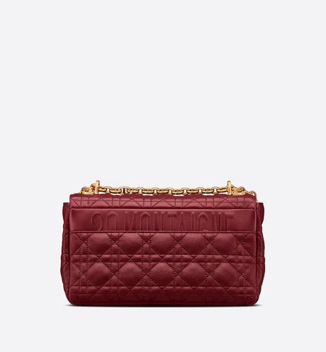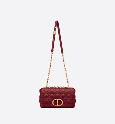 The Dior Caro bag combines modernity with timeless elegance. The design is crafted in brick red calfskin with Cannage stitching. The supple bag features a flap adorned with an antique gold-finish metal 'CD' twist clasp. inspired by the seal of a Christian Dior perfume bottle. The detachable chain shoulder strap with 'CD' signature links allows it to be carried by hand. over the shoulder or crossbody. or replaced by one of the House's wide embroidered straps. allowing the medium bag to pair with day or evening attire.