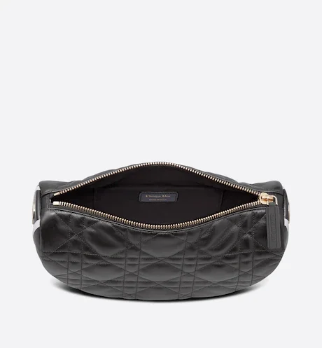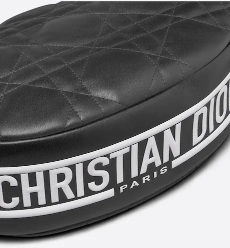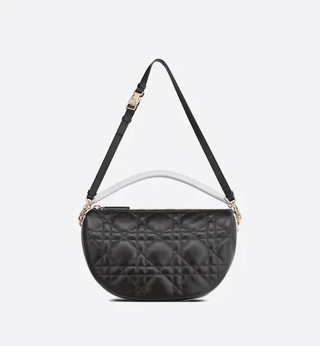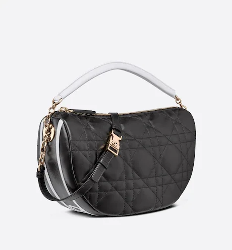 New this season. Maria Grazia Chiuri imagines the Dior Vibe bag with the allure of a Hobo bag showcasing modern lines. The white Cannage lambskin style has a suede calfskin interior while a black 'CHRISTIAN DIOR PARIS' signature adorns the bottom of the bag. Featuring a handle in addition to a removable and adjustable shoulder strap with a military-inspired buckle. the small Dior Vibe bag can be carried by hand. worn on the shoulder or crossbody for a sportier look.
