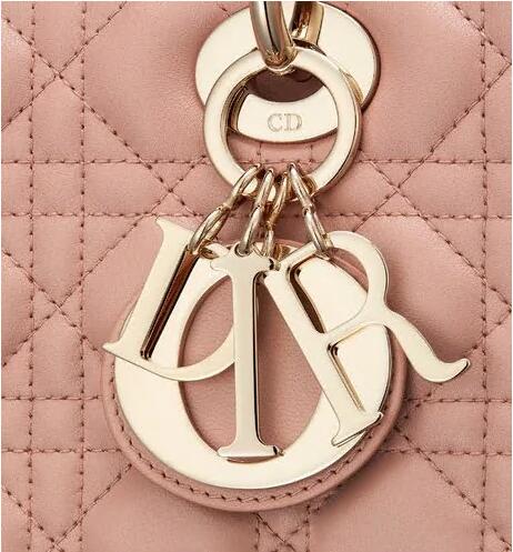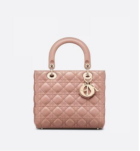The season's Lady Dior bag embodies Dior's vision of elegance and beauty. The refined creation is timeless yet still very relevant. Crafted in blush lambskin with Cannage stitching. its quilted texture instantly stands out. while the pale gold-finish metal 'D.I.O.R.' charms further embellish the silhouette. The medium style features a thin. removable leather shoulder strap and can be carried by hand. worn over the shoulder or crossbody.