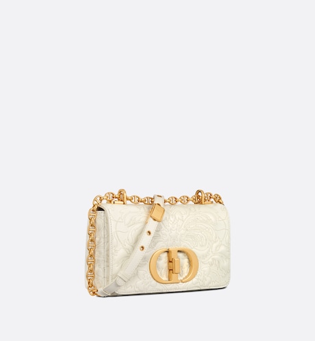 The Dior Caro bag combines modernity with timeless elegance. The design is crafted in latte quilted lambskin revealing the Ornamental motif. inspired by Andalusian baroque in a graphic spirit. The bag features a flap adorned with an antique gold-finish metal 'CD' twist clasp. inspired by the seal of a Christian Dior perfume bottle. The detachable chain shoulder strap with 'CD' signature links allows it to be carried by hand. over the shoulder or crossbody. or replaced by one of the House's wide embroidered straps. allowing the small bag to pair with day or evening attire.