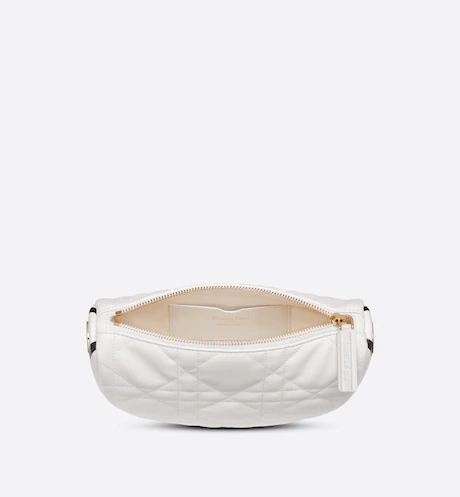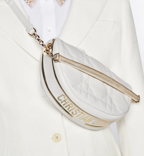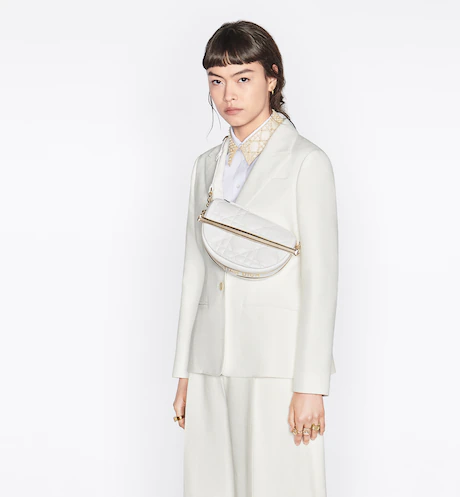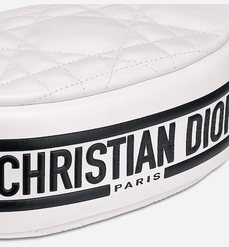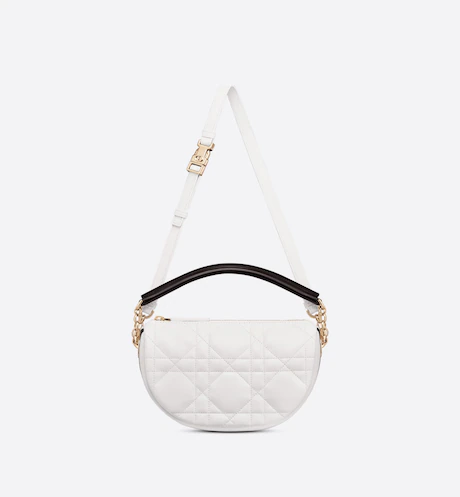 New this season. Maria Grazia Chiuri imagines the Dior Vibe bag with the allure of a Hobo bag showcasing modern lines. The white Cannage lambskin style has a suede calfskin interior while a black 'CHRISTIAN DIOR PARIS' signature adorns the bottom of the bag. Featuring a handle in addition to a removable and adjustable shoulder strap with a military-inspired buckle. the small Dior Vibe bag can be carried by hand. worn on the shoulder or crossbody for a sportier look.
