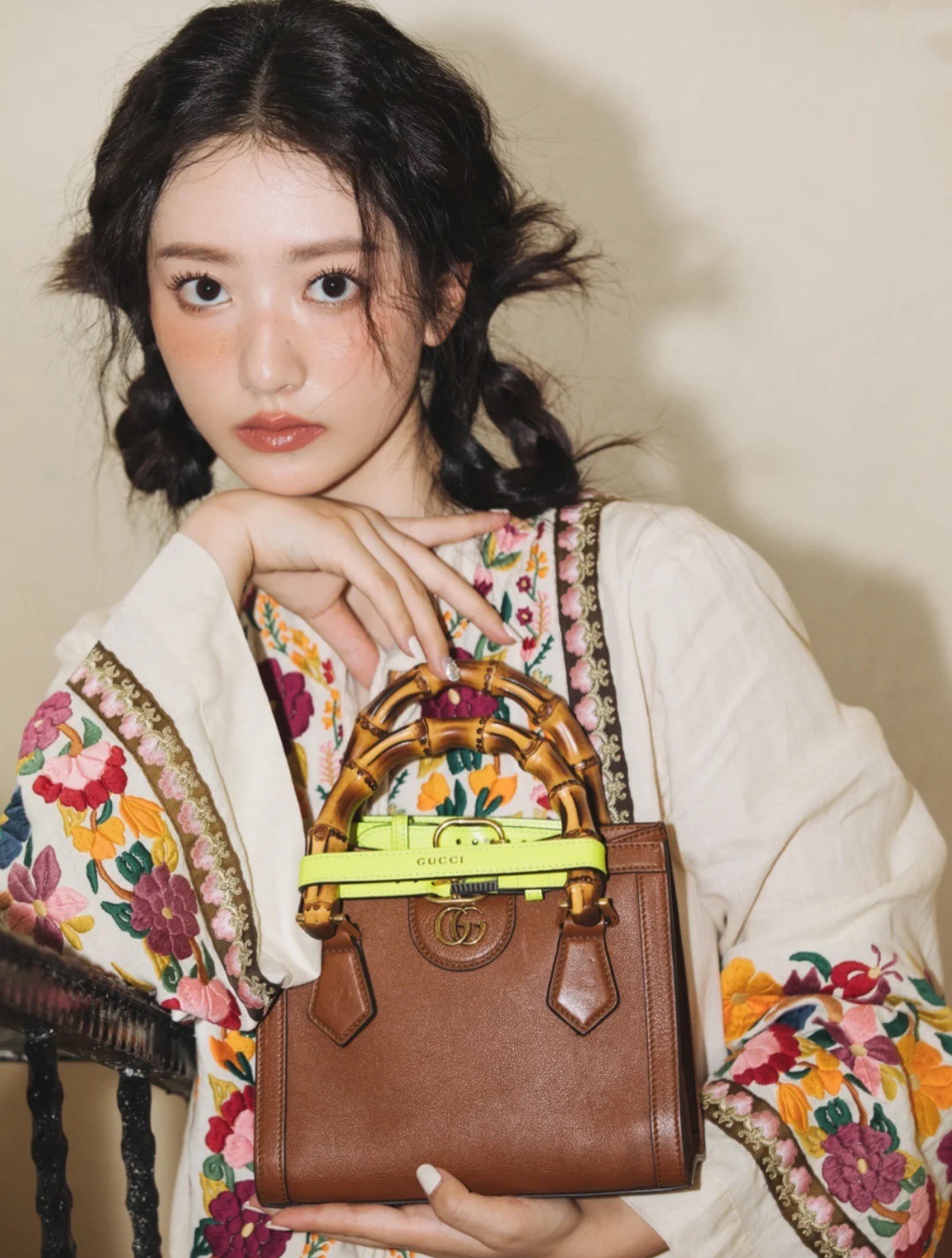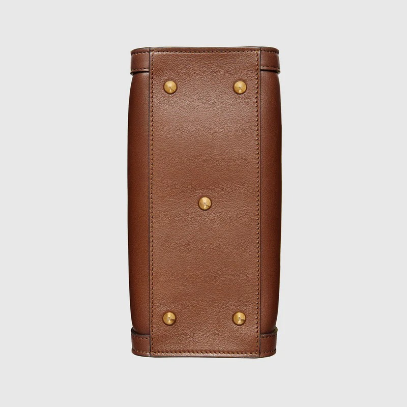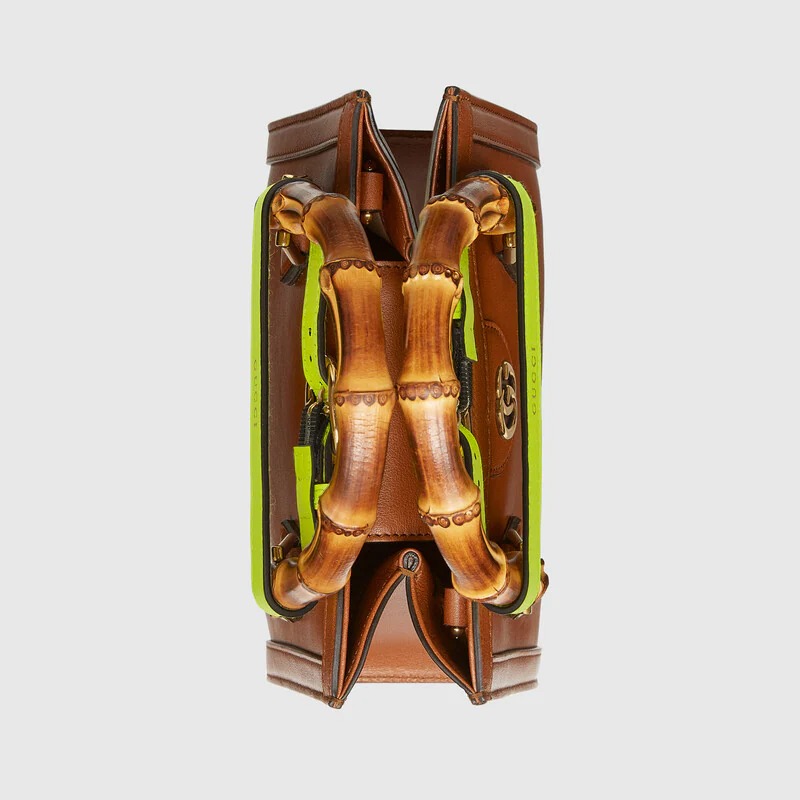 グッチを象徴するさまざまなエレメントを散りばめたミニ トートバッグ。バンブー ハンドルとダブルG ハードウェアがデザインのポイントです。ブラウン レザーで仕立てたバッグに、ネオンカラーのストラップを2本配しました。ハンドルの形を保つためのバンドを模した、遊び心あるディテールです。