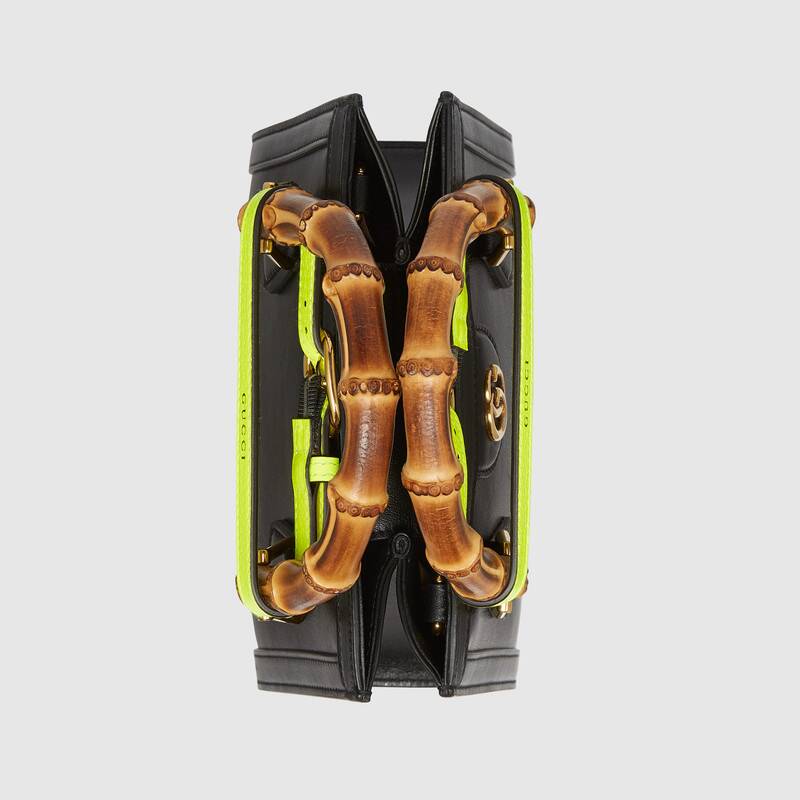 グッチを象徴するさまざまなエレメントを散りばめたミニ トートバッグ。バンブー ハンドルとダブルG ハードウェアがデザインのポイントです。ブラック レザーで仕立てたバッグに、ネオンカラーのストラップを2本配しました。ハンドルの形を保つためのバンドを模した、遊び心あるディテールです。