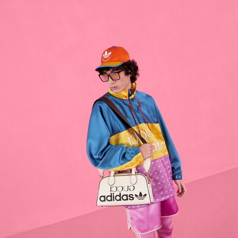 adidas x Gucci コレクションに登場したこのミニサイズのダッフルバッグは、”GUCCI adidas”&トレフォイル プリントがデザインのポイント。アディダスとグッチが初めて挑んだ本コラボレーションでは、ウェブ ストライプとホワイトのスリーストライプスの並びに、GGパターンとトレフォイルが組み合わされています。クリエイティブ・ディレクター、アレッサンドロ・ミケーレの1980年代から1990年代にかけての記憶を着想源に、グッチを象徴するモチーフと歴史あるスポーツウェアブランドであるアディダスのロゴをミックスすることで生まれた、ハイブリッドなシリーズです。2022年6月7日より販売開始