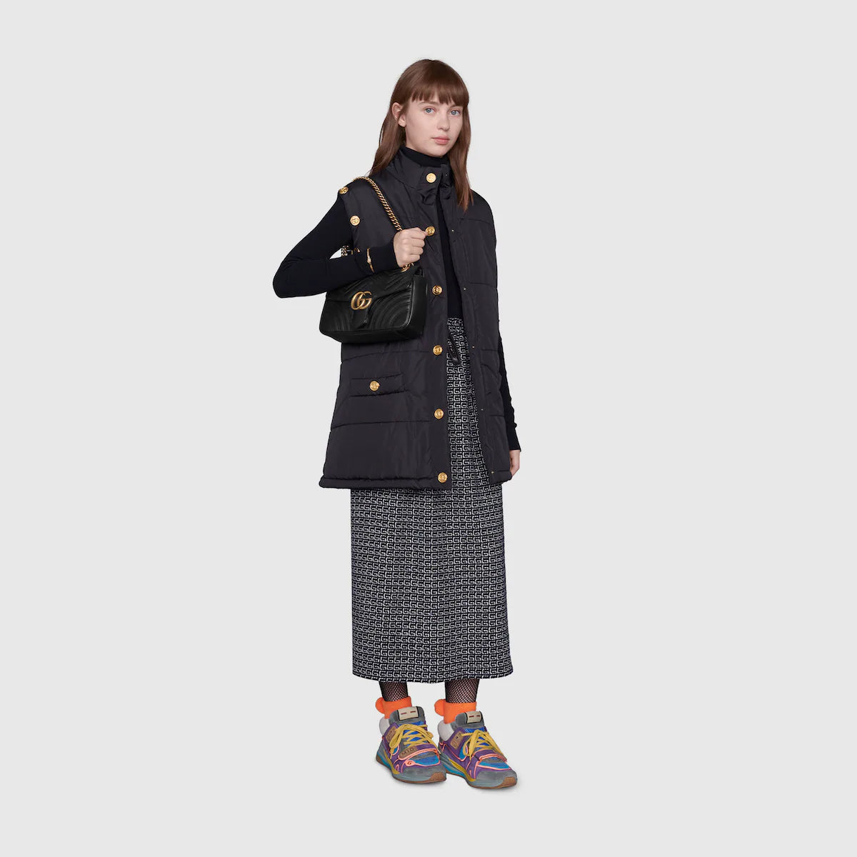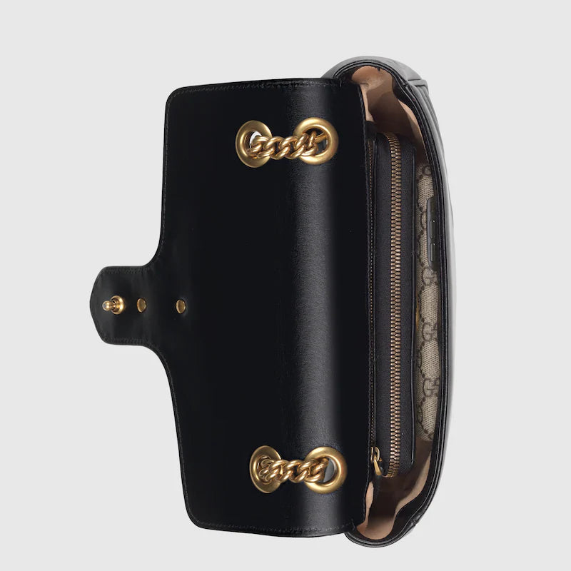 ソフトなストラクチャードシェイプが特徴的なスモールサイズの〔GGマーモント〕 チェーンショルダーバッグ。オーバーサイズのフラップ クロージャーにダブルG ハードウェアがあしらわれています。スライド式チェーンストラップにより、ショルダーバッグからトップハンドルバッグまでさまざまなスタイルでご使用いただけます。バックのGGが印象的なキルティング シェブロンレザー製。