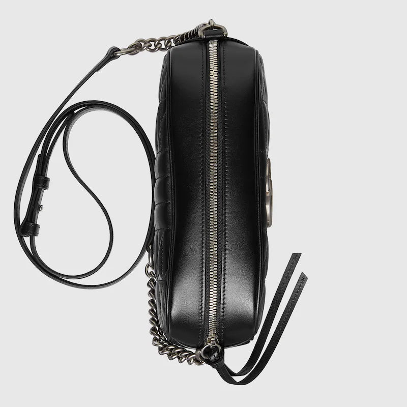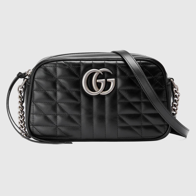 〔GGマーモント〕ラインのバッグは、キルティングレザーとブランドを象徴するダブルG ハードウェアが特徴です。Aria コレクションではラインを象徴するキルティングレザーに新しくジオメトリック風のアレンジを加え、ダブルGのハードウェアはアンティーク調のシルバートーンで仕上げました。ここではブラックの小ぶりなショルダーバッグに仕立てています。