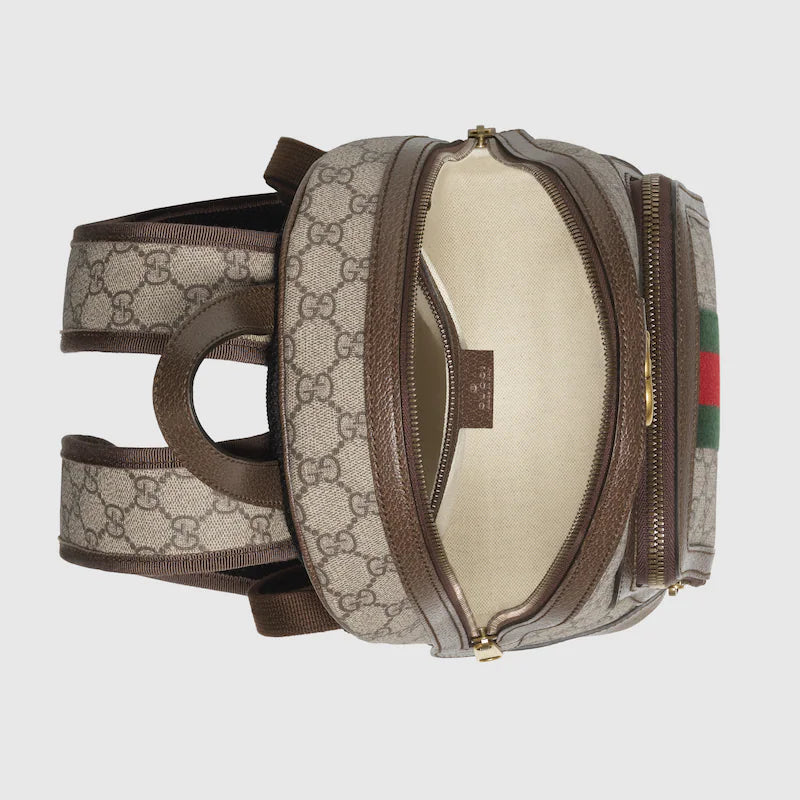 バックパックはグッチのコレクションの重要なアイテムとして、多様なサイズとフォルムで展開されています。〔オフィディア〕ラインの新作として登場したこのバッグは、GGスプリーム キャンバスに、テクスチャードレザーのトリムがあしらわれました。1950年代からグッチのコレクションに組み込まれてきたシンボルであるグリーン/レッド/グリーンのウェブ ストライプ ディテールとダブルG ハードウェアがグッチの豊かな歴史を思い起こさせます。