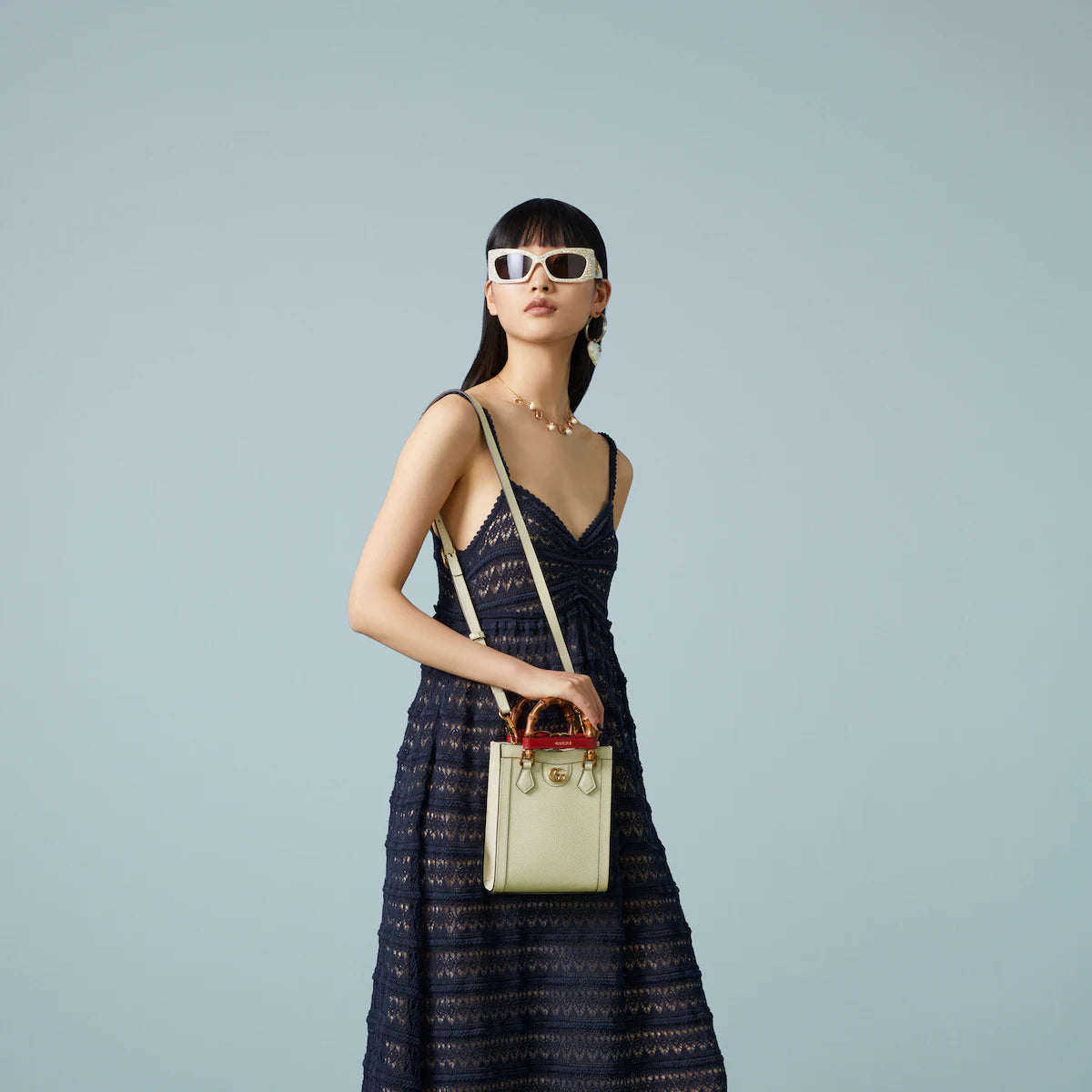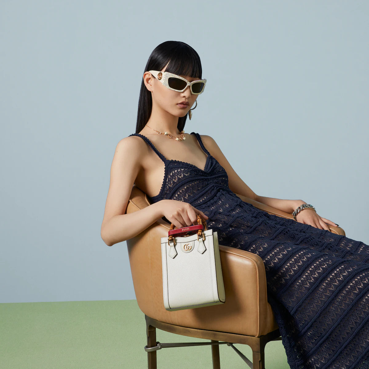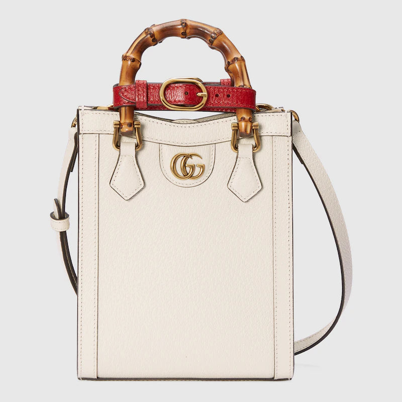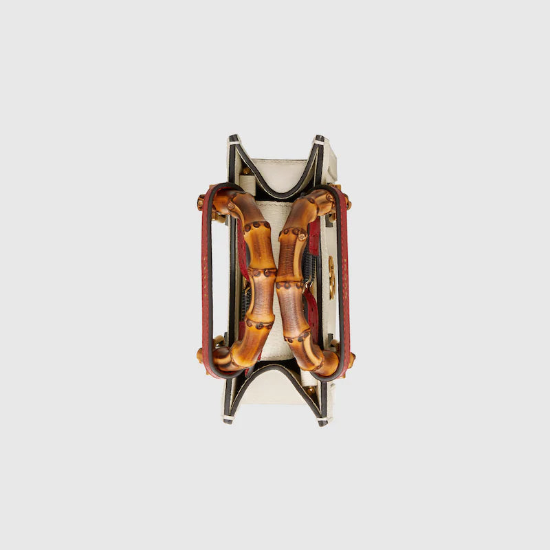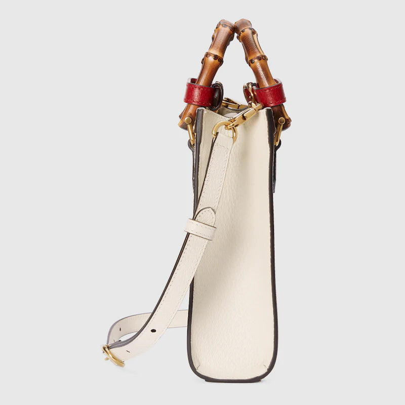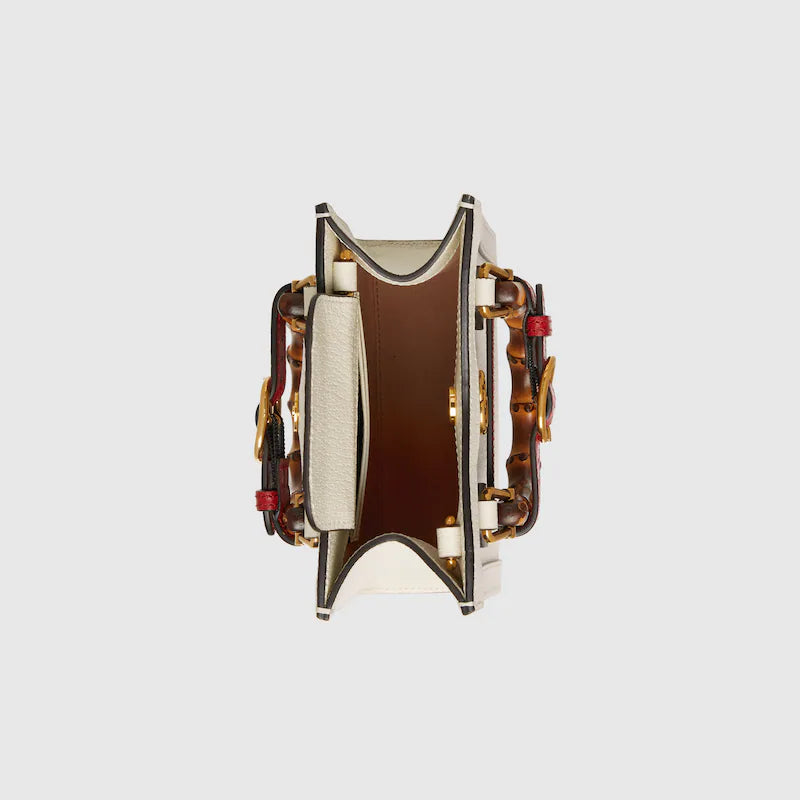 グッチを象徴するさまざまなエレメントを散りばめた、ミディアムサイズのトートバッグ。バンブー ハンドルとダブルG ハードウェアがデザインのポイントです。ホワイト レザーで仕立てたバッグのハンドルには、2本の装飾的なレザー バンドを配しました。ハンドルの形を保つために付けられていたバンドを模し、洗練されたディテールとして表現したものです。