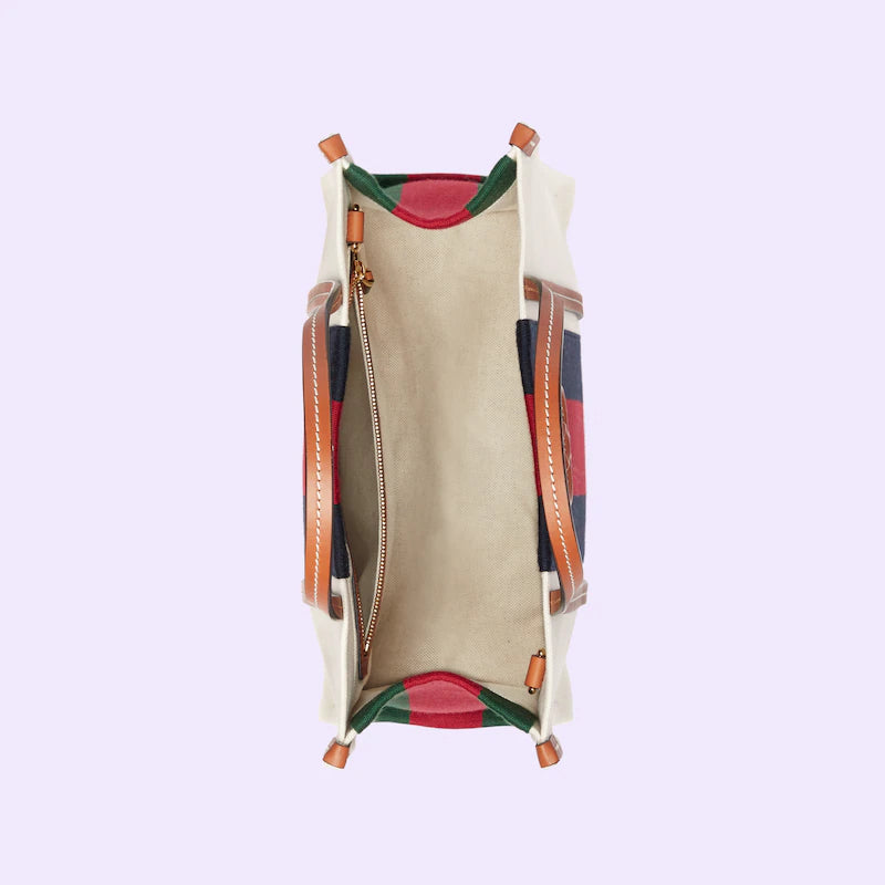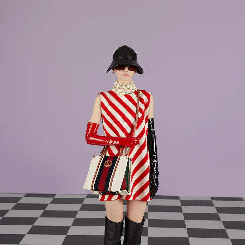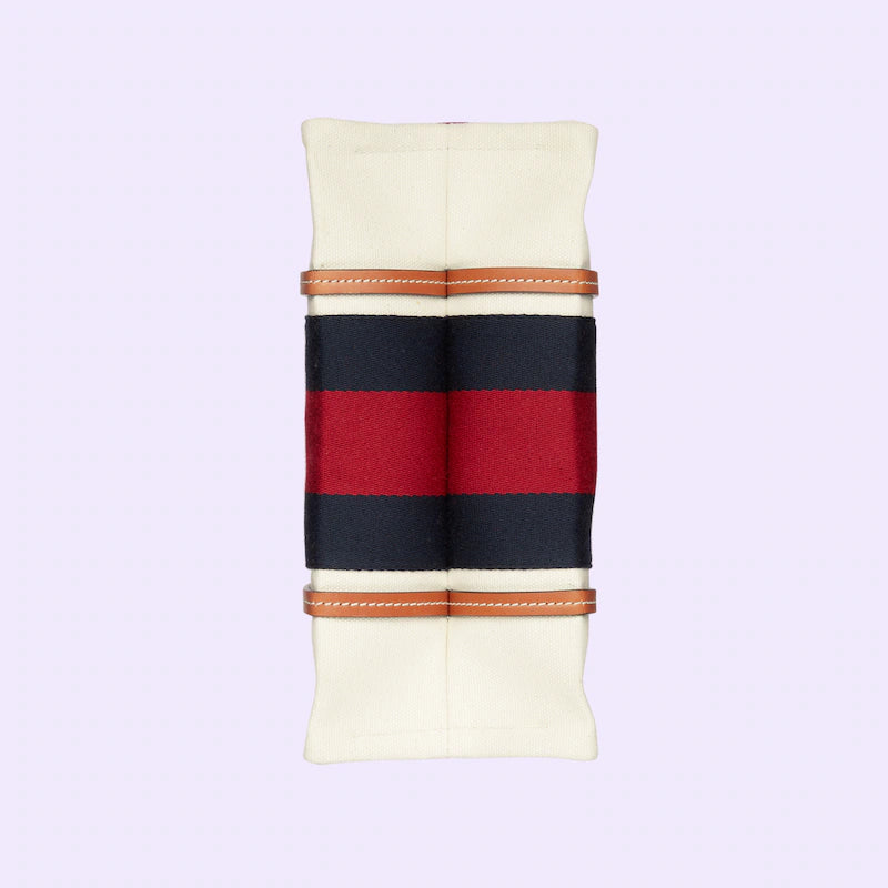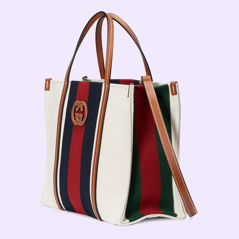 グッチのアーカイブデザインを元にジオメトリックなフォルムに仕上げたインターロッキングG ロゴは、今シーズンもハンドバッグの最新セレクションを彩っています。ここではシグネチャーであるブルー/レッド/ブルーのウェブ ストライプと組み合わせることで、ホワイト キャンバスのベースとの鮮やかなコントラストを演出しました。
