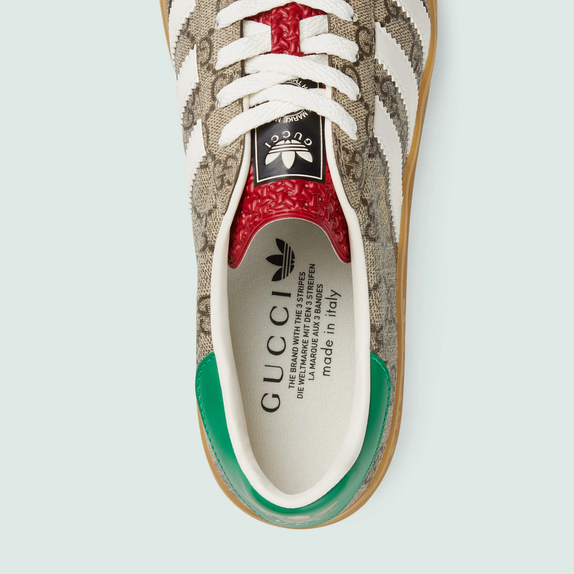 ウェブ ストライプとホワイトの3本線を融合させ、GGパターンとトレフォイルを組み合わせた、adidas x Gucci コレクションの第2弾。クリエイティブ・ディレクター、アレッサンドロ・ミケーレの1980年代から1990年代にかけての記憶を着想源に、グッチを象徴するモチーフと歴史あるスポーツウェアブランドであるアディダスのロゴをミックスすることで生まれた、ハイブリッドなラインです。グッチを象徴する〔ガゼル〕スニーカーを、ベージュ&エボニー GGスプリーム キャンバスで仕立てました。
