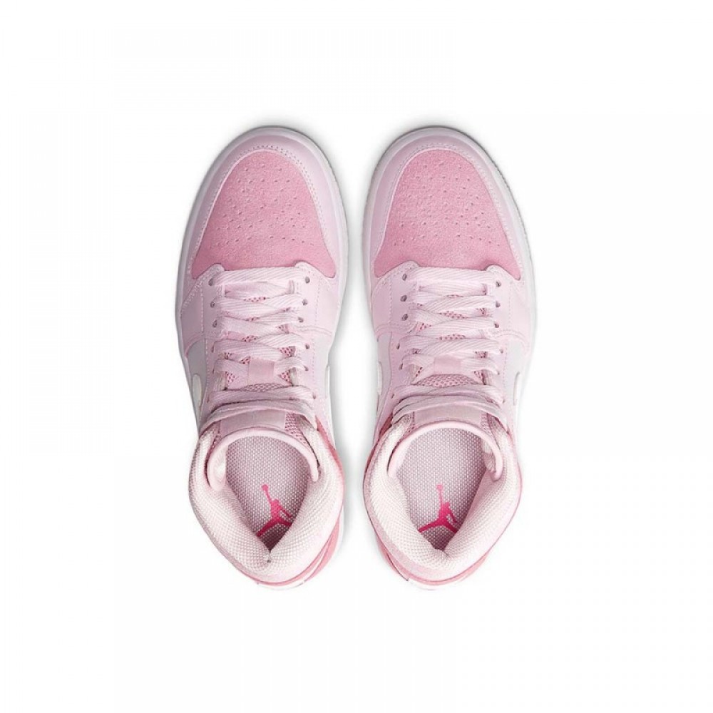 このミッドトップのエアジョーダン1は、デジタルピンク、ホワイト、ピンクフォーム、セイルの色の組み合わせで登場します。トゥボックスにスエード、オーバーレイにレザーを使用し、足首にシルク素材を配置。また、襟とヒールオーバーレイにバスケットボールのテクスチャレザーを使用しています。また、ミッドソールにはホワイト、アウトソールにはピンクのラバーが使用されています。