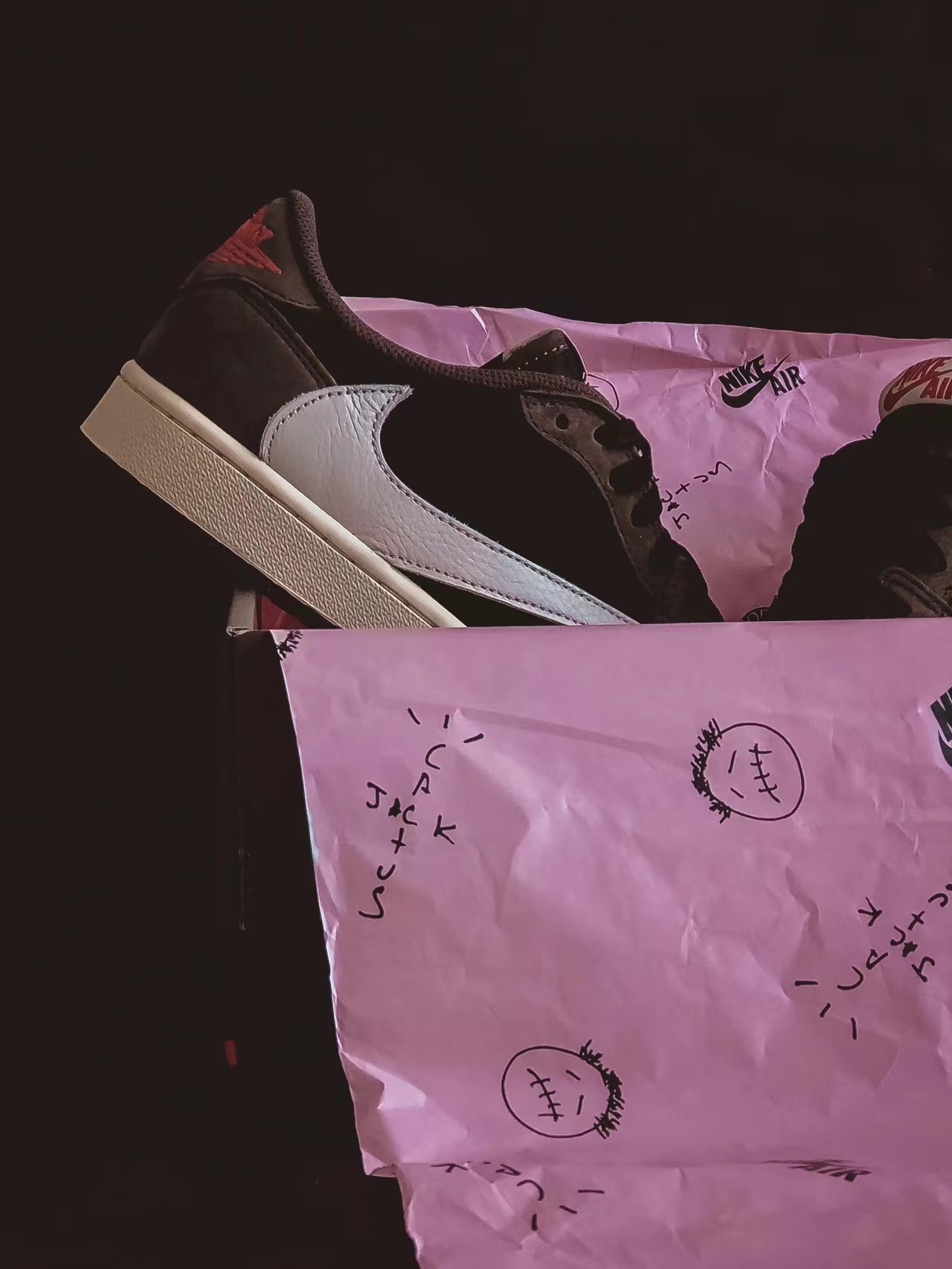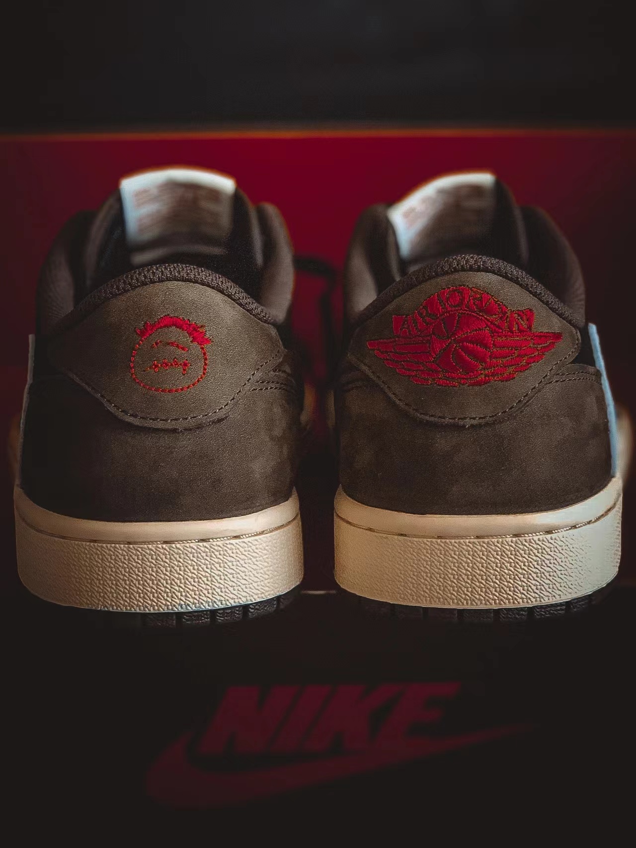 Travis Scott x Air Jordan 1 Lowは、世界的に有名なラッパーによるジョーダン1コラボのロートップ版です。2019年春の標準的なハイトップのジョーダン1に続き、このジョーダン 1 ロー バイ トラヴィス スコットは7月に非常に限られた数量でリリースされ、最初のデザインと同じハイプと切望されたステータスを達成しました。スコットは再びアースカラーへの親和性を示しながら、最初のハイトップと同じバックワードスウッシュのデザインも利用しました。アッパーはブラックとブラウンを基調としたプレミアムヌバックで構成され、大きく反転したスウッシュはホワイトレザーとコントラストを成しています。また、タングタグとヒールロゴの刺繍には赤のハイライトが施され、セイルミッドソールがクリーンなデザインを完成させる。