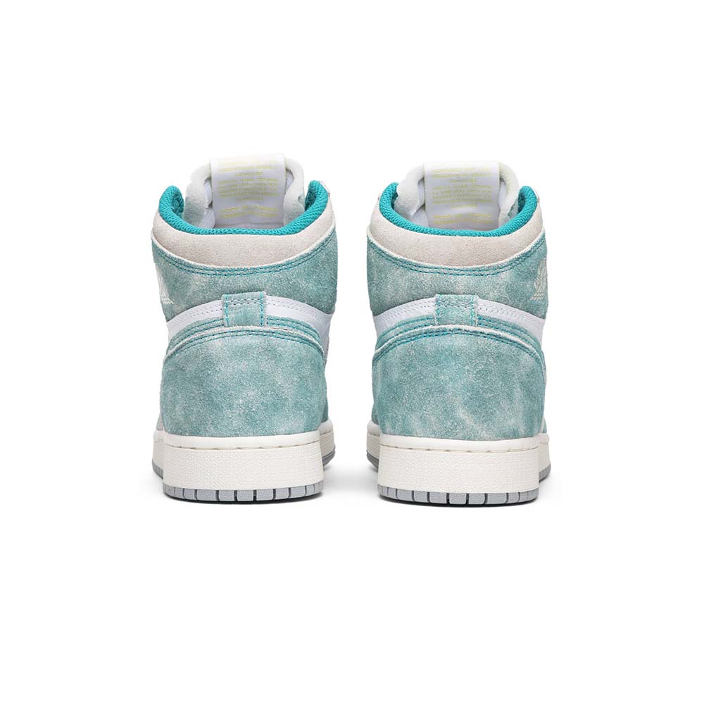 エア ジョーダン 1 ハイ GS "ターボグリーン "は、2019年にリリースされた人気カラーウェイのキッズ向け小学生サイズです。アッパーのレザーにディストレスト加工を施してヴィンテージ効果を出し、キッズのジョーダン 1は、2019年のNBAオールスターゲームを開催したNBAチーム、シャーロット・ホーネッツに敬意を表して、紫と黄色のヒントを加えたティールと白のカラーリングを採用しています。クリーム色のミッドソールがヴィンテージの美学を継続させるのに役立ち、各ペアはグレーのアウトソールで完成します。ユースのエア ジョーダン 1 ハイ GS "ターボグリーン "は、2019年2月15日に発売されました。
