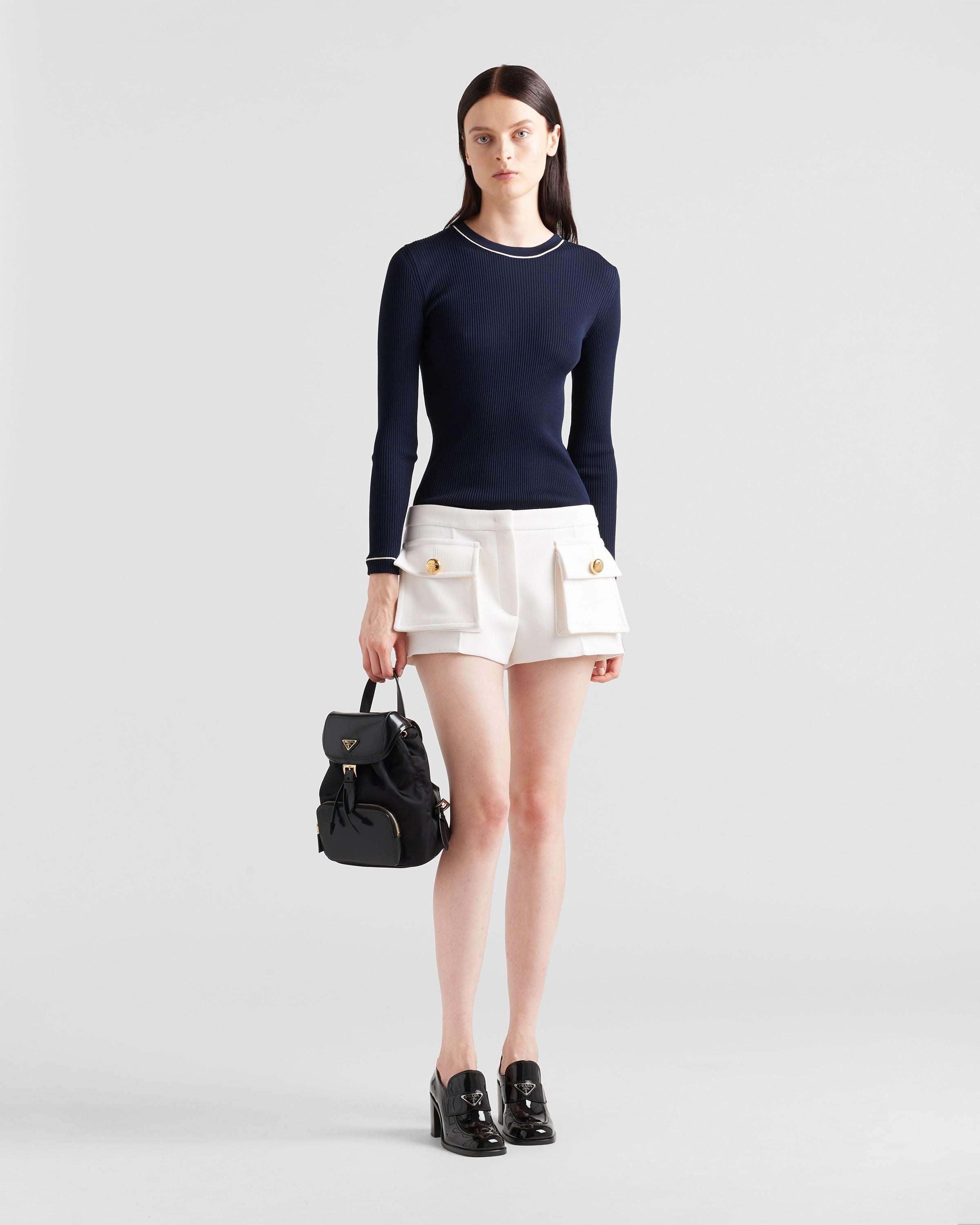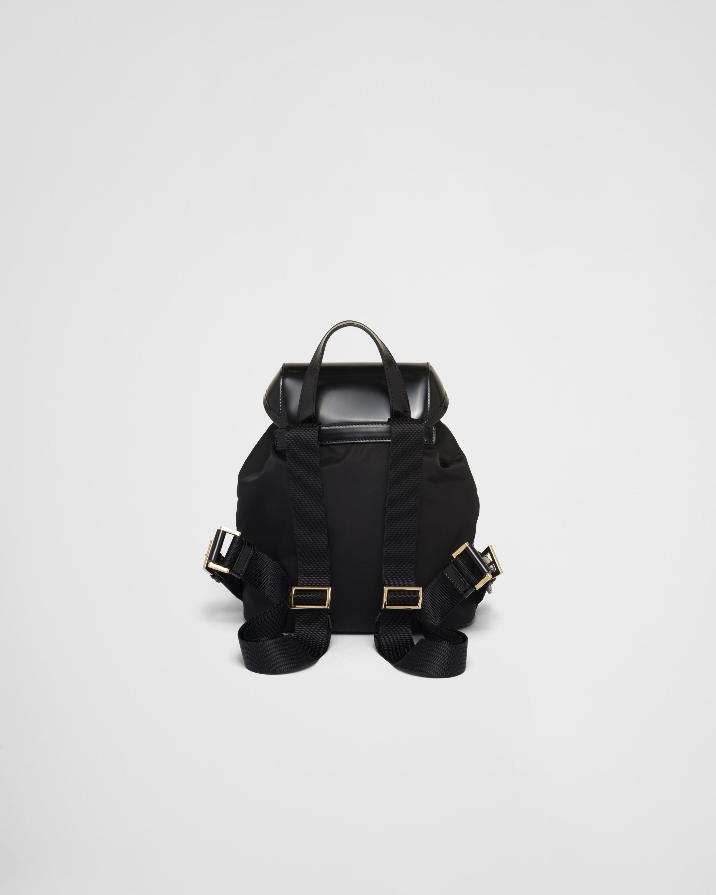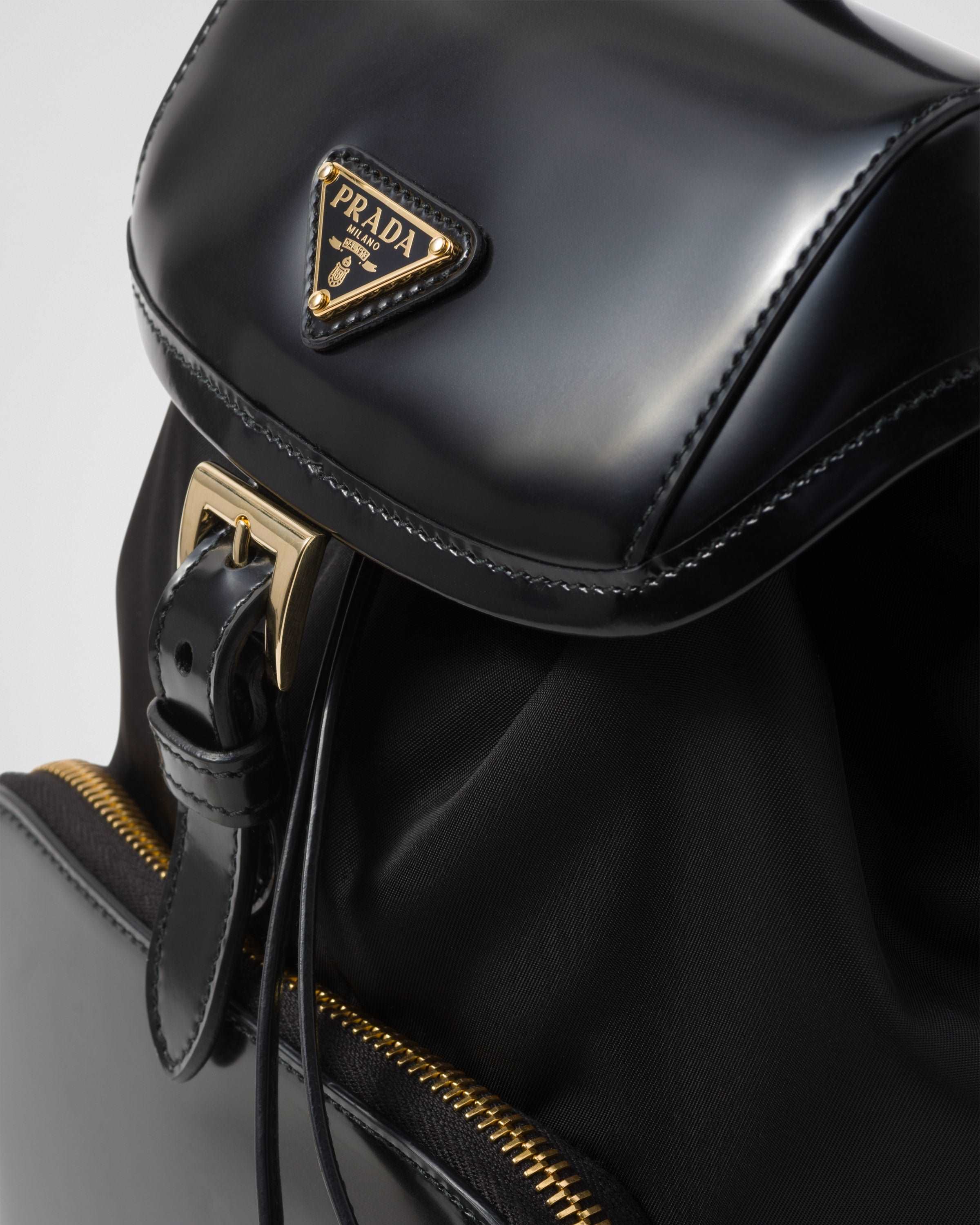革新的な再生ナイロン素材のRe-Nylonに、洗練されたレザーのディテールとメタルパーツを組み合わせた、ハイブリッドなデザインのバックパック。外側にファスナー付ポケットを配し、エナメルメタルのトライアングルロゴをあしらった、エレガントで使い勝手に優れたアイテム。