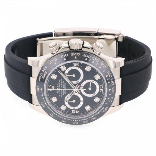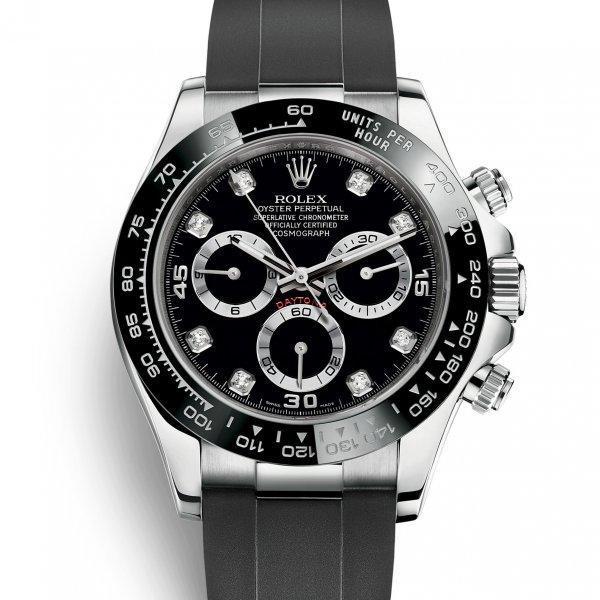 18 ct ホワイトゴールドのオイスター パーペチュアル コスモグラフ デイトナは、ブラック、ダイヤモンド入りダイアルとオイスターフレックスブレスレットを備え、ブラック セラクロムタキメーターベゼルが特徴的である。