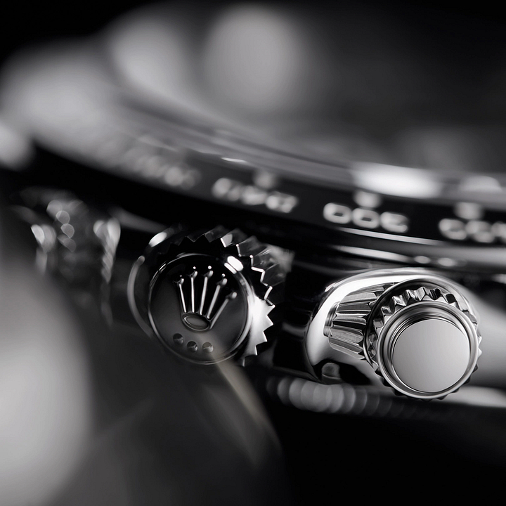 デイトナ クロノグラフの機能は 使用しない間にはリューズのようにねじ込まれ 100mまでの防水性能を確保するプッシャーにより作動する。クロノグラフ機能のスタート ストップ リセットを押すと 最新テクノロジーが可能にした カチっとした鋭い音が響く。ロレックスの時計技師はまた プッシュボタンを押した時に指に最高の感触が与えられるよう そして時計の精度に影響を与えずに瞬時に そして正確に計測が開始されるよう 機構に最高の技術力を投じた。