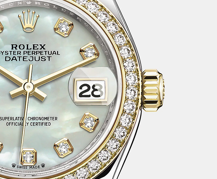 マザーオブパールは 驚きに満ちた神秘的な性質を備えている。産地によってピンク ホワイト ブラック イエローと 色彩が異なり 貝殻の採取部位によっても色彩の強度や構造が変化する。ロレックスのマザーオブパールには人工的な着色は一切行われない。代わりに 特別なノウハウとスキルを駆使し その自然の美しさのみを際立たせ 本来の色合いを保持している。マザーオブパールのダイアルにはふたつとして同じものはない。
