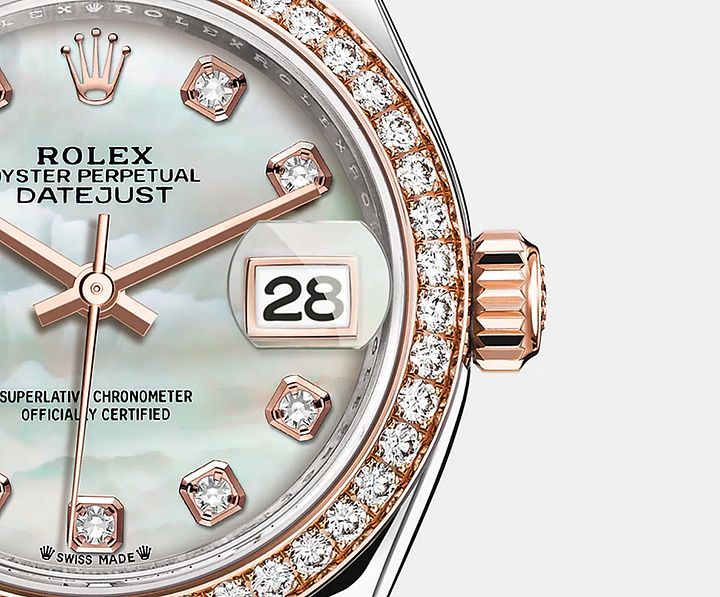 マザーオブパールは 驚きに満ちた神秘的な性質を備えている。産地によってピンク ホワイト ブラック イエローと 色彩が異なり 貝殻の採取部位によっても色彩の強度や構造が変化する。ロレックスのマザーオブパールには人工的な着色は一切行われない。代わりに 特別なノウハウとスキルを駆使し その自然の美しさのみを際立たせ 本来の色合いを保持している。マザーオブパールのダイアルにはふたつとして同じものはない。